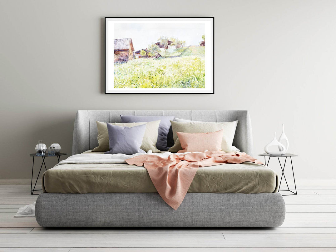 Farm Houses with White Blooming Field – Marie Egner | Classic Landscape Art Print -