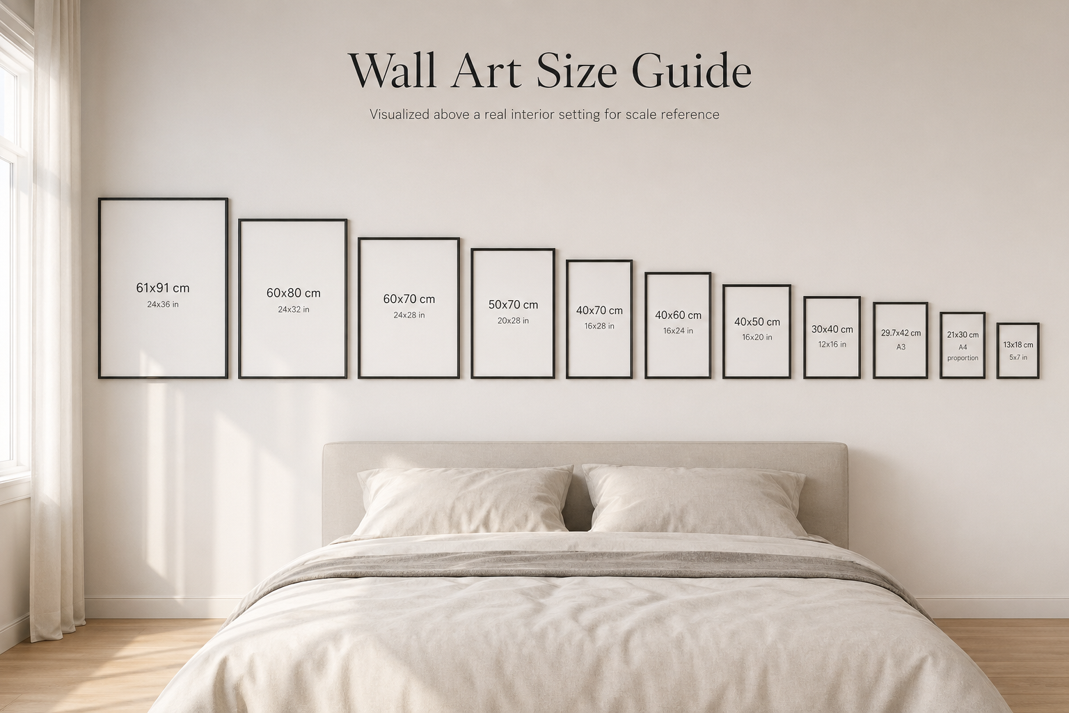 Explore how each size works in real interior spaces, from small accent pieces to large statement and oversized formats.