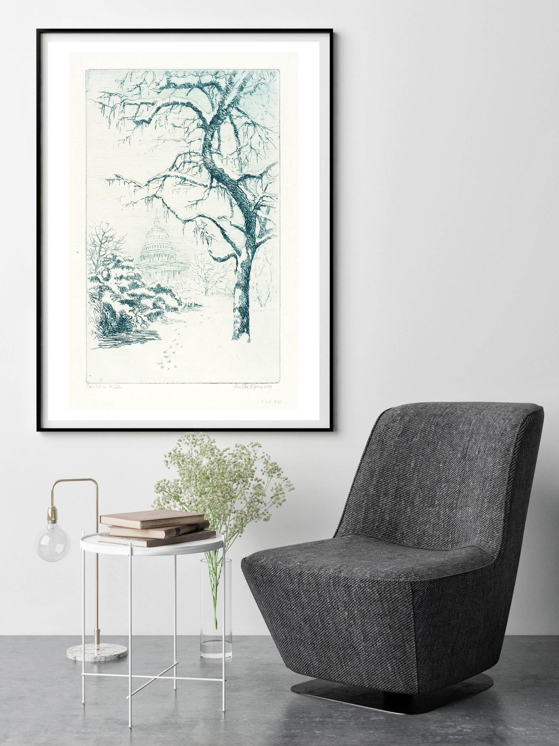 Bring the elegance of 19th-century American architecture into your home with “Capitol in Winter” (1863) by Bertha Jaques. This historic print captures the Capitol building in a serene winter landscape, highlighting Jaques’ attention to detail and composition. Perfect for collectors of American historical art and anyone seeking sophisticated architectural wall décor, this reproduction adds both heritage and style to any interior.