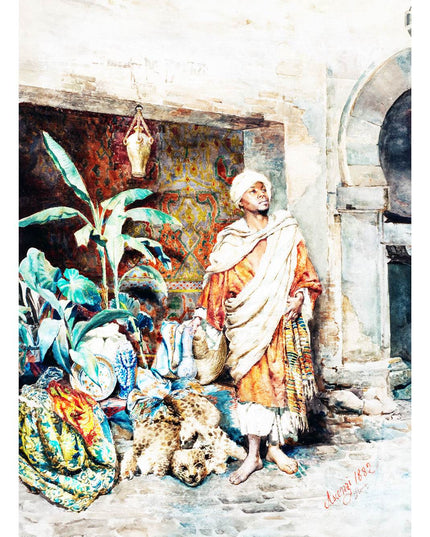 Figure d'un Maure (1882) de Carlo Ascenzi témoigne de la maîtrise de l'artiste en peinture figurative du XIXe siècle, mettant en valeur l'étude détaillée des personnages, la richesse des textures et le subtil jeu d'ombres et de lumières. L'œuvre d'Ascenzi reflète à la fois maîtrise technique et narration culturelle, offrant un aperçu des traditions historiques du portrait.