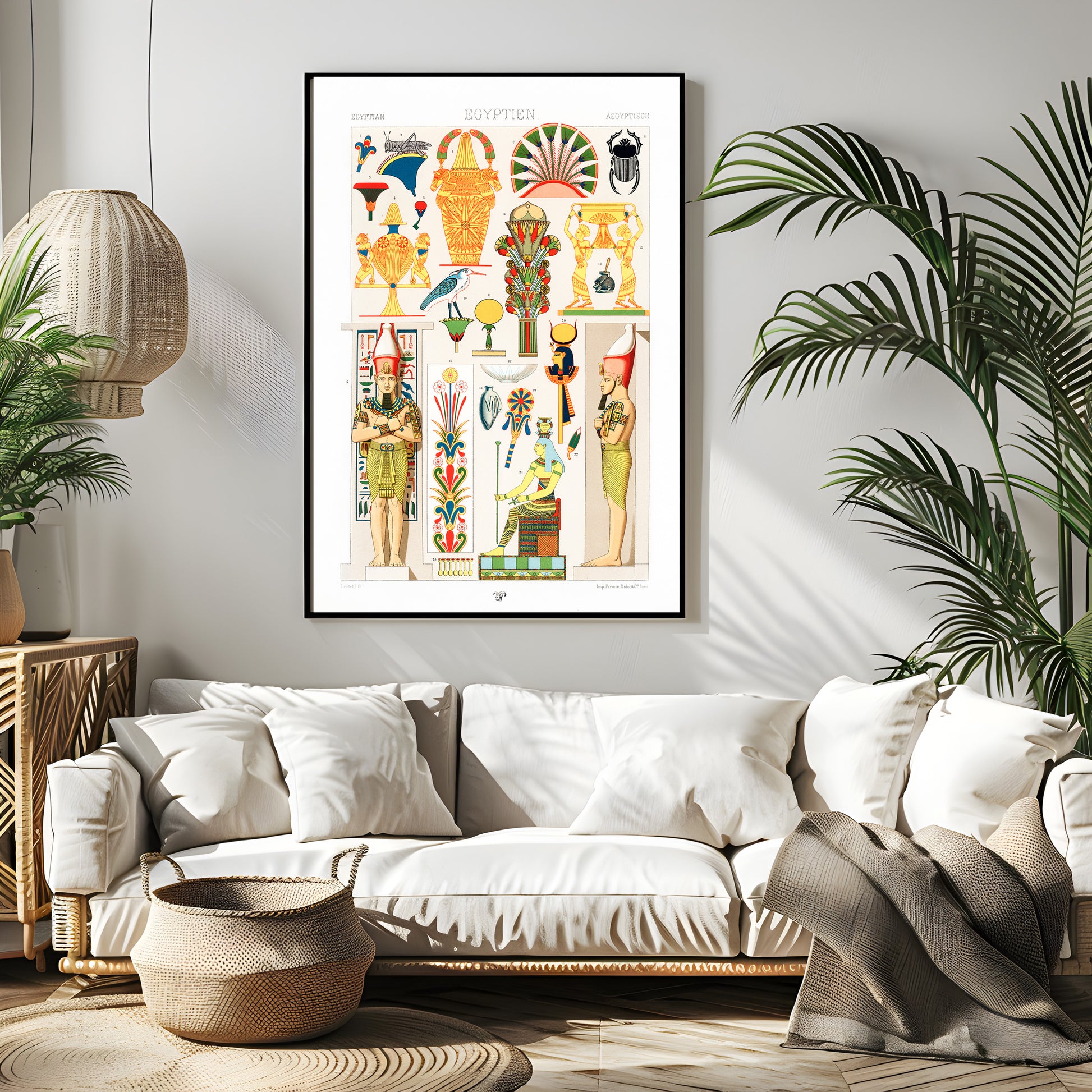 L'illustration de L'Ornement Polychrome 'Egyptien' est une pièce remarquable créée par Auguste Racinet en 1888. Cette œuvre met en valeur les motifs complexes et les couleurs vibrantes caractéristiques de l'ornementation égyptienne.