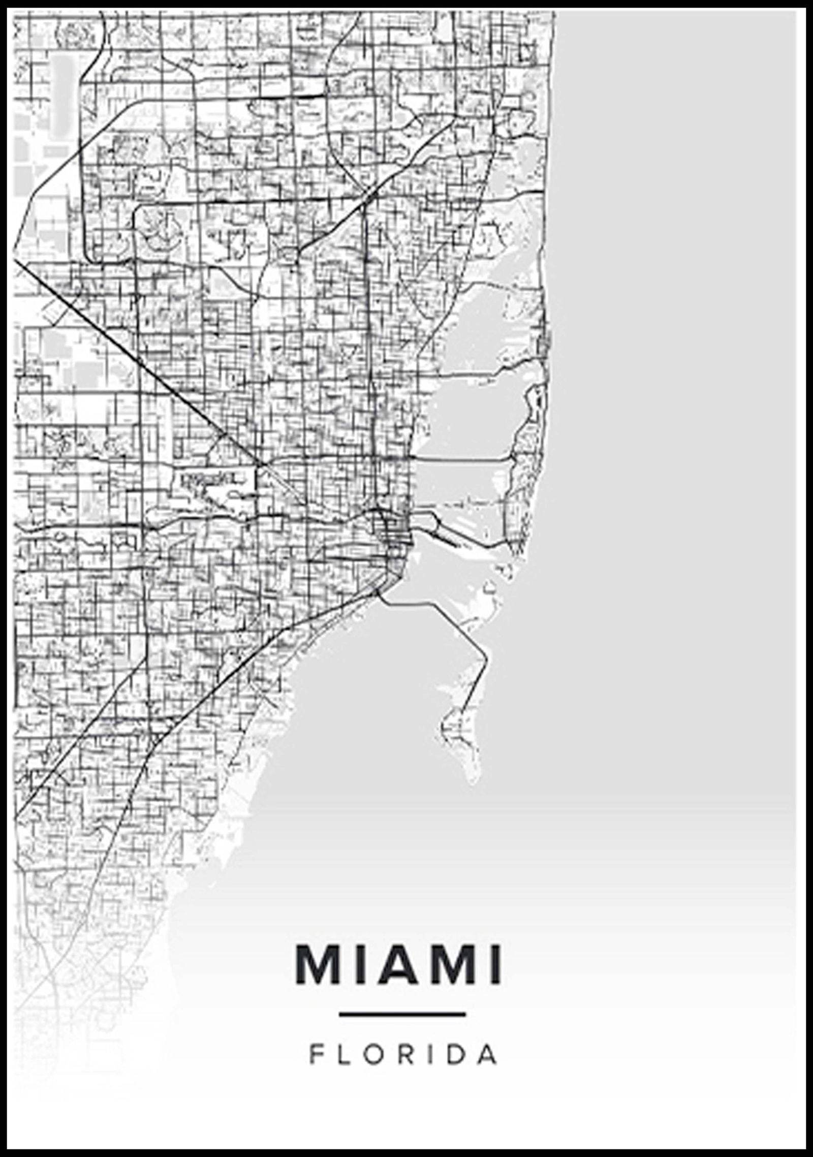 Affiche avec une carte en noir et blanc de Miami, Floride.