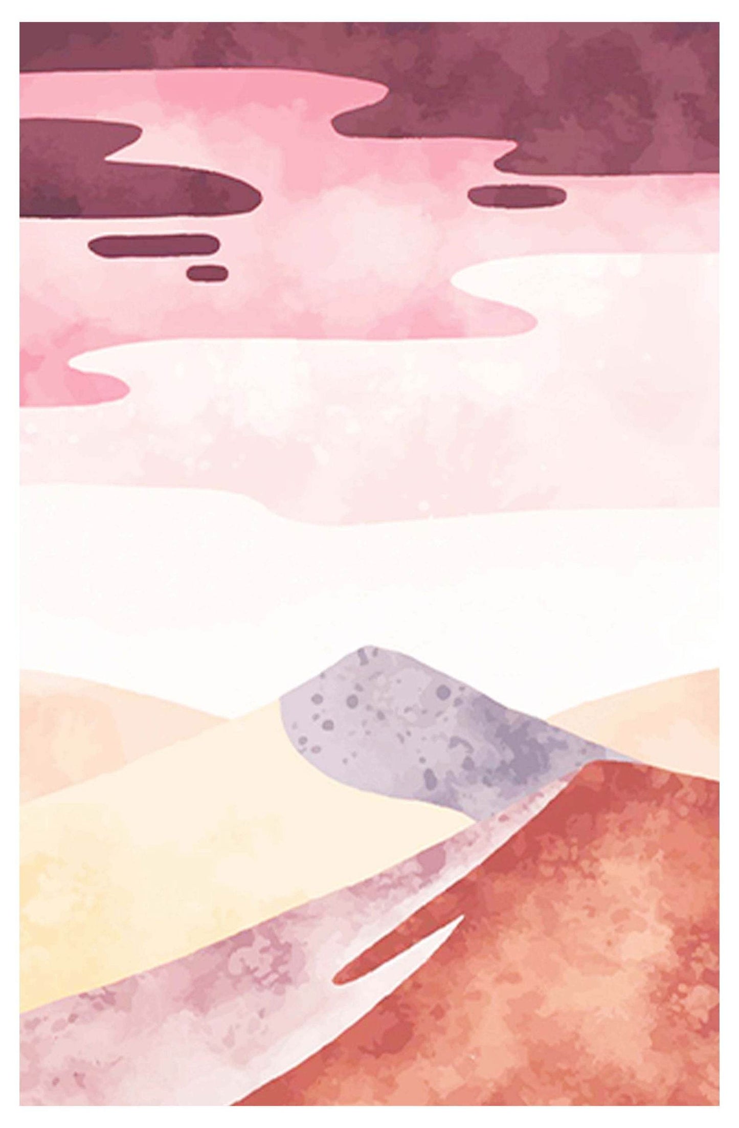 L'affiche « Pays apaisant » n° 2 est un ajout enchanteur à votre décoration intérieure. Cet adorable paysage à l'aquarelle représente une magnifique chaîne de montagnes au coucher du soleil, dans une palette onirique de teintes rose tendre.