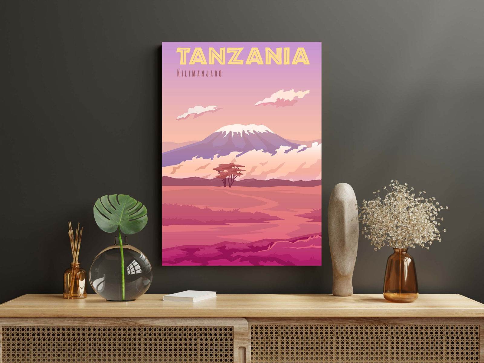 Cette affiche colorée présente une belle vue de la Tanzanie, un endroit très apprécié des amateurs de voyages. Cette affiche de voyage a été soigneusement conçue pour faire ressortir les nombreuses nuances du paysage africain.