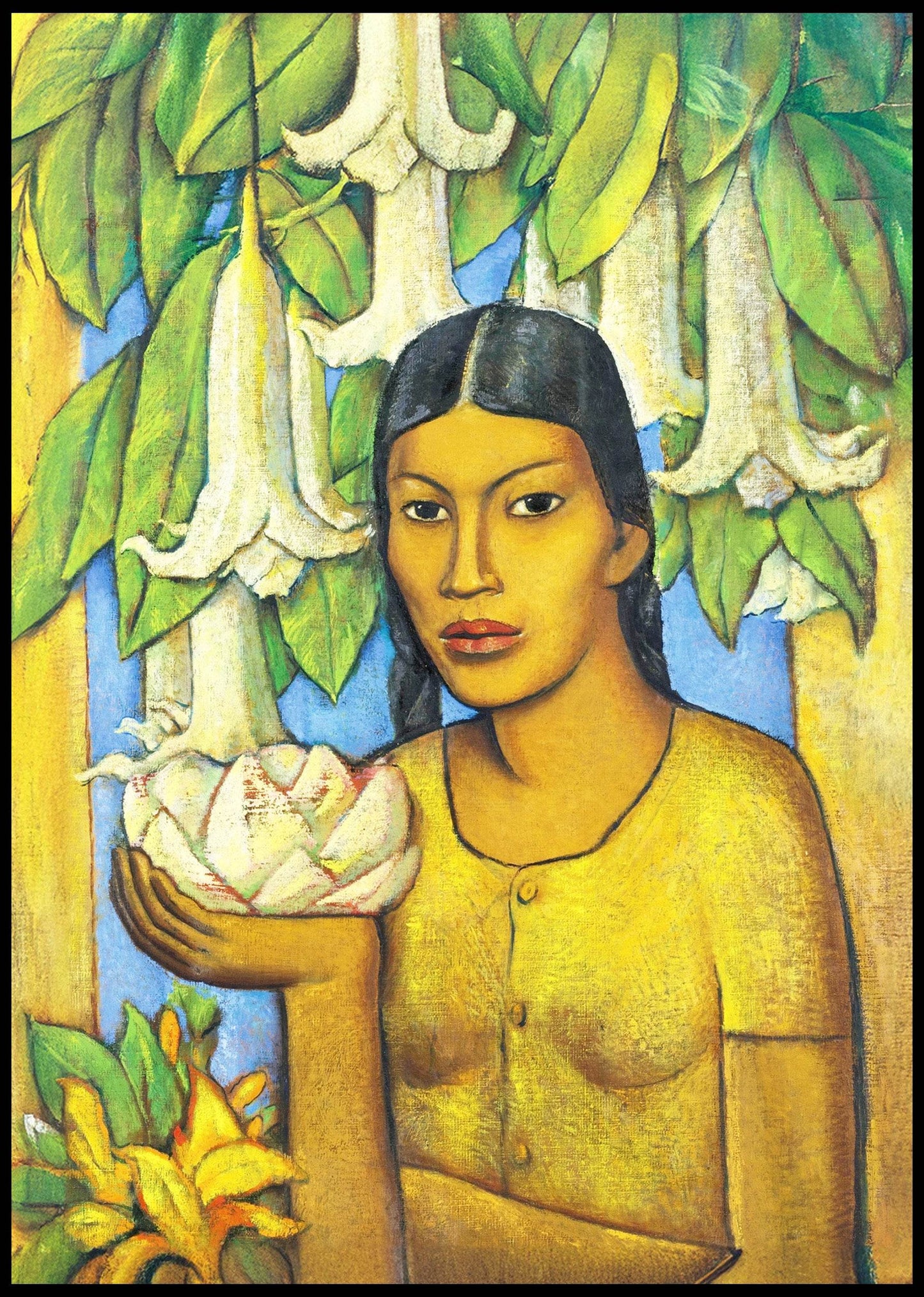 In this work, the figure is surrounded by floripondio blossoms, their bold forms and vibrant presence reinforcing the harmony between humanity and nature. Perfect for admirers of Latin American art, cultural heritage, and modernist expression, this art print adds depth, elegance, and authenticity to any interior.
