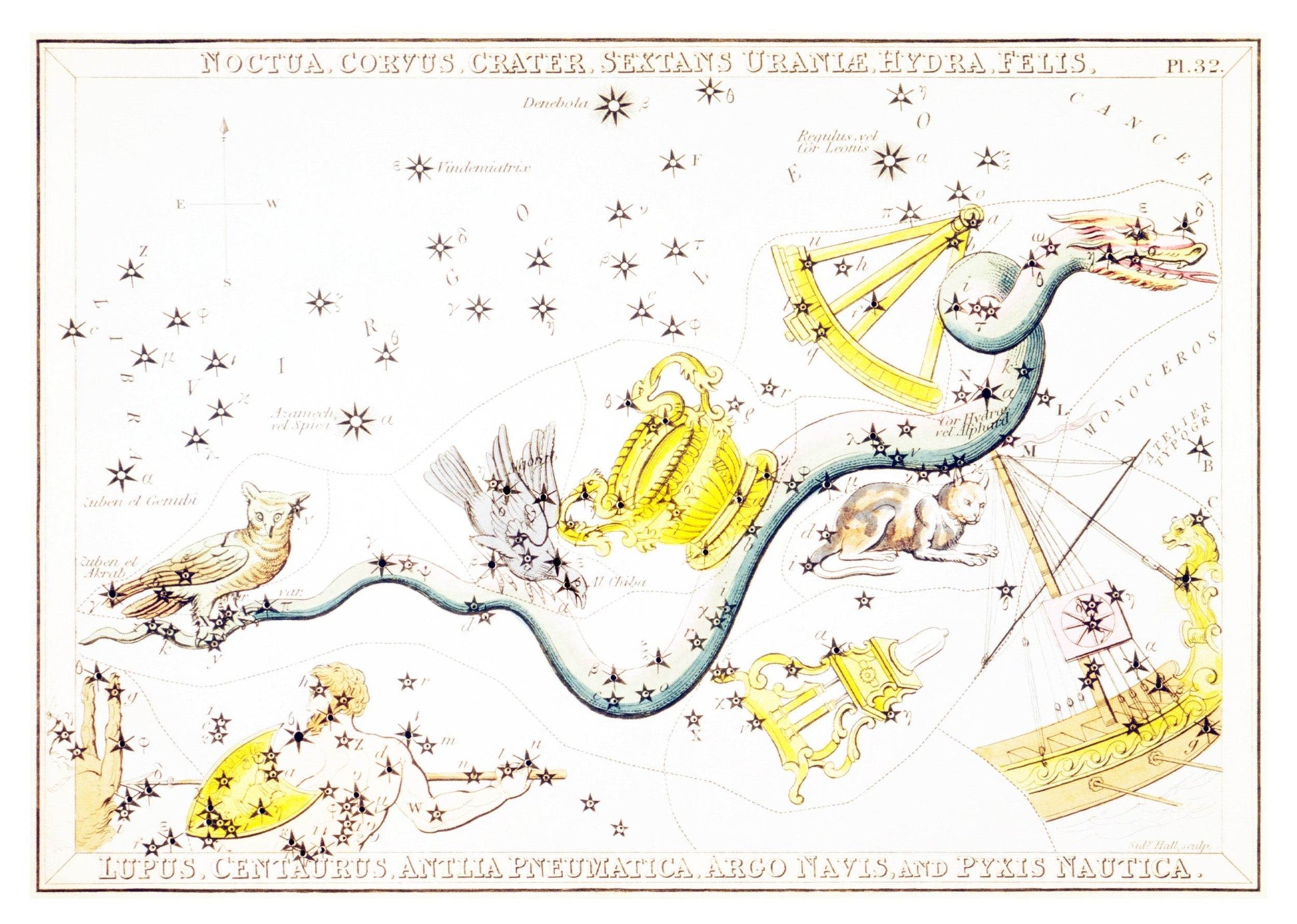 Noctua, Corvus, Crater, Sextans Uraniæ, Hydra, Felis, Lupus, Centaurus, Antlia Pneumatica, Argo Navis, and Pyxis Nautica