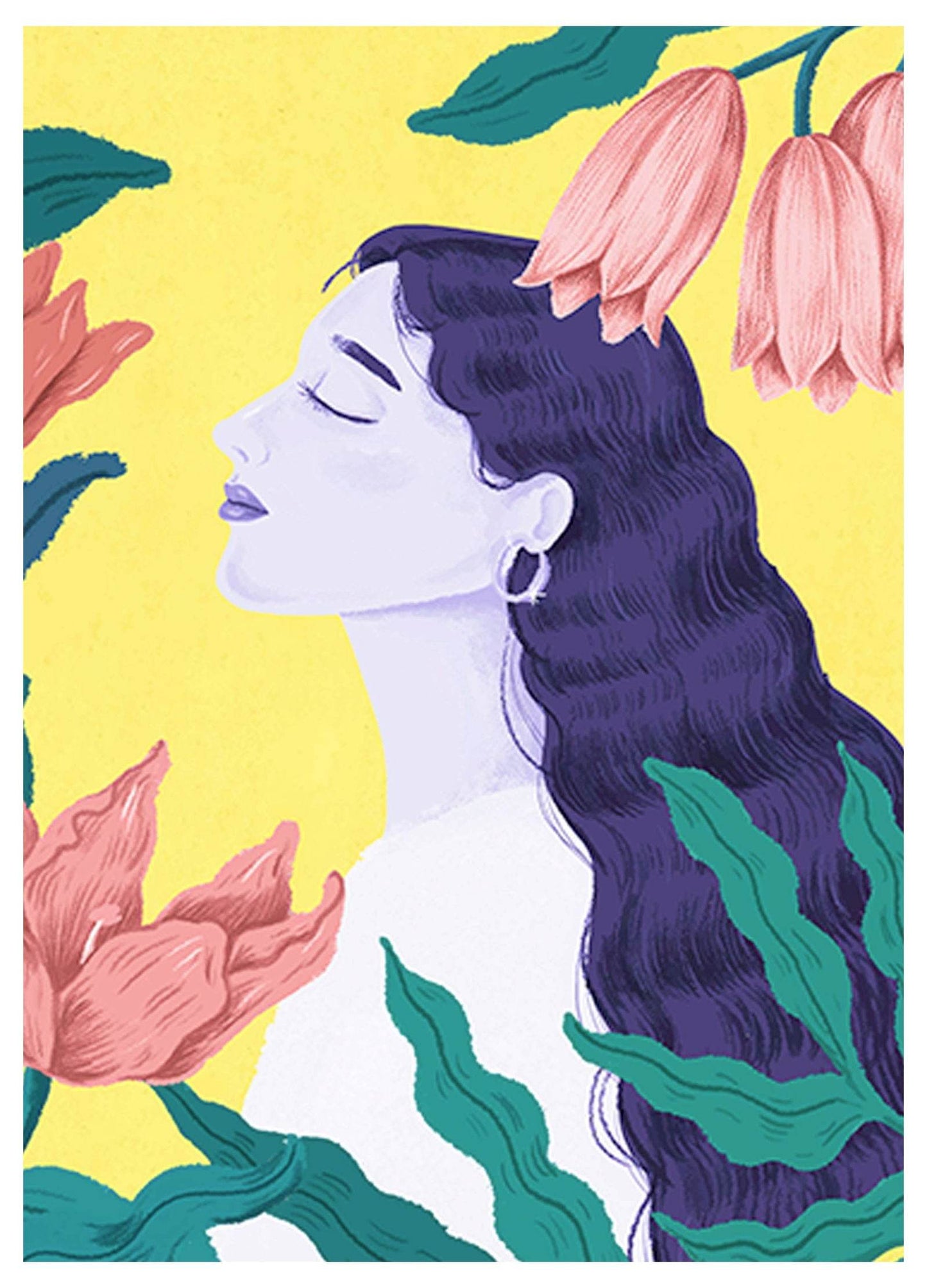 Hand-drawn and digitally colored, this contemporary floral poster print shows a woman  at the center of a flowing field of flowers.