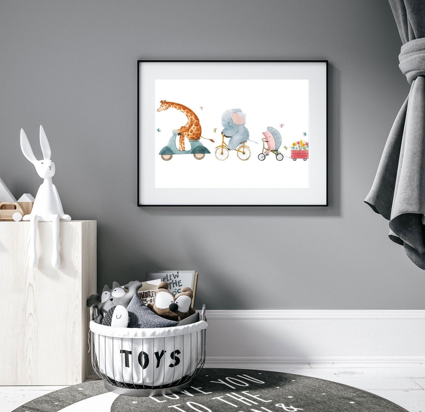These lovely animals are out for a ride! With a cute and clever illustration, this poster is perfect for a nursery or bedroom.
