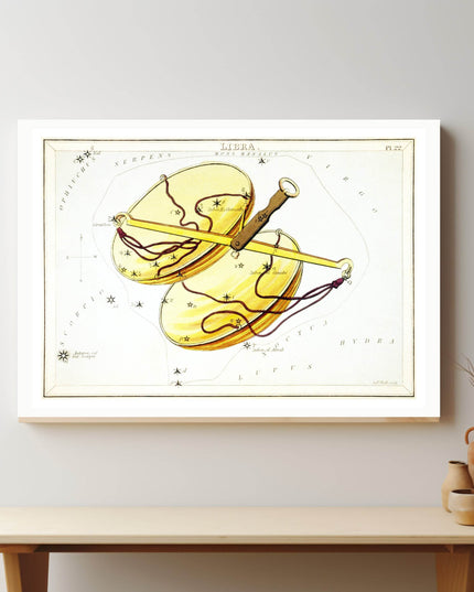Libra is a stunning celestial artwork created by Sidney Hall in 1825, showcasing the constellation of Libra alongside Leo Minor. This exquisite piece captures the intricate details of the stars, reflecting the artistry and precision of Hall's work.