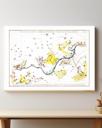 Noctua, Corvus, Crater, Sextans Uraniæ, Hydra, Felis, Lupus, Centaurus, Antlia Pneumatica, Argo Navis, and Pyxis Nautica is a stunning collection of celestial maps by Sidney Hall, created in 1825. This exquisite set showcases the beauty and intricacy of the night sky, featuring detailed illustrations of various constellations.