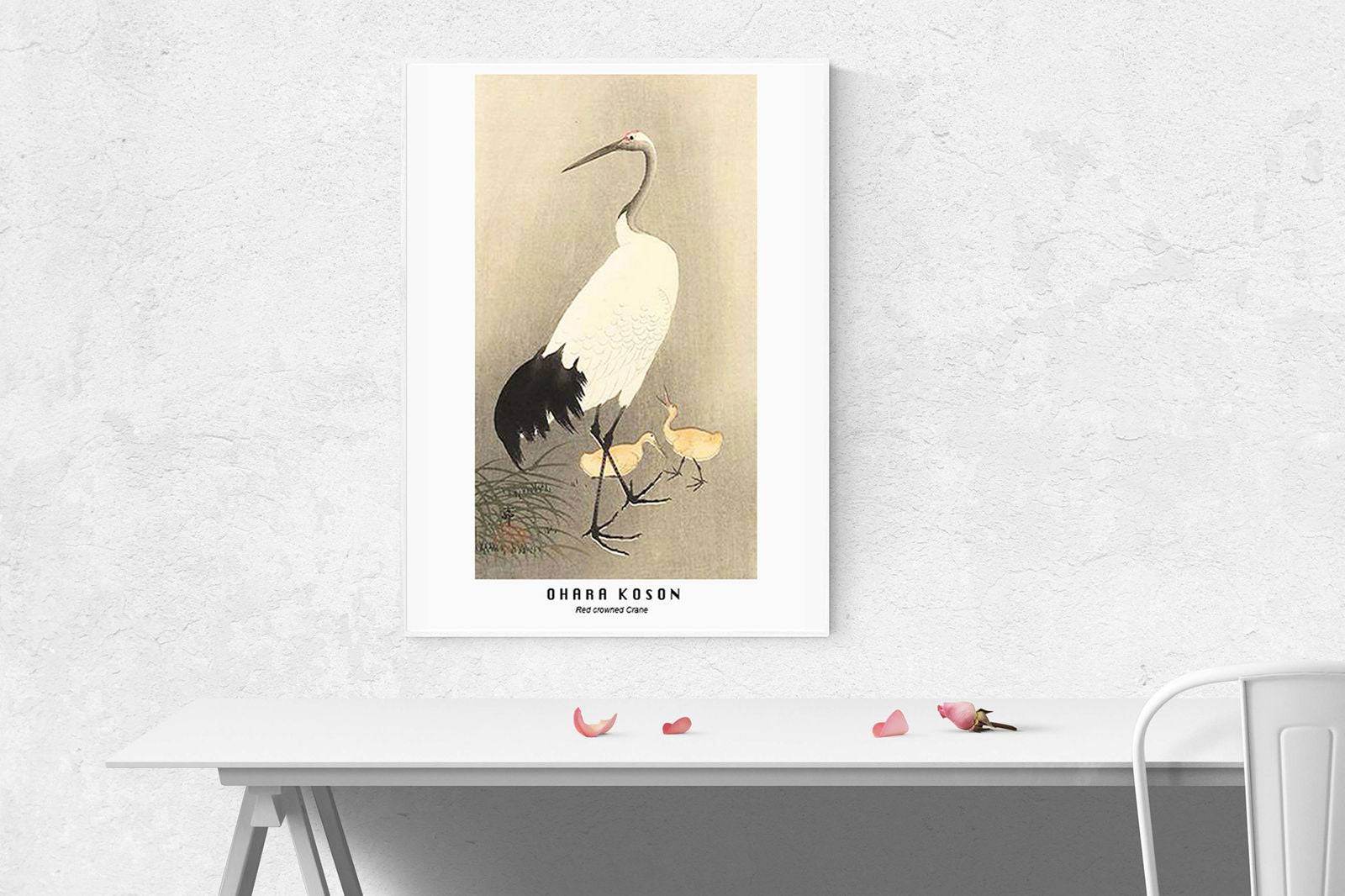The composition balances naturalistic detail with minimalist beauty, creating a harmonious scene that evokes tranquility and refinement. Perfect for lovers of Japanese art and nature-inspired decor, this art print brings a sense of peace and sophistication to any interior. Celebrate the artistry of Koson and invite the serene presence of the crane into your space.